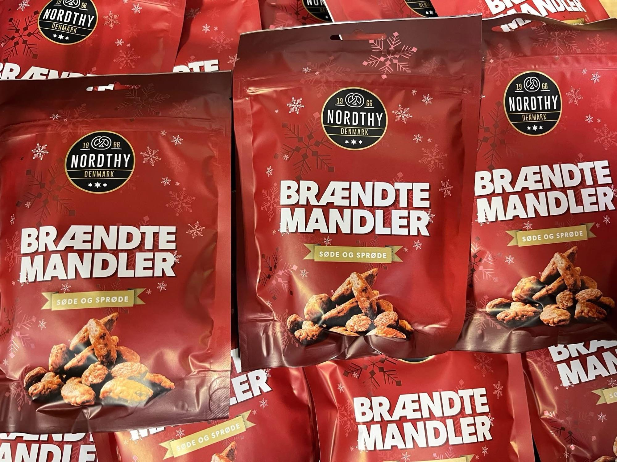 Vi har skaffet et stort parti brændte mandler søde og sprøde med 90 gr.