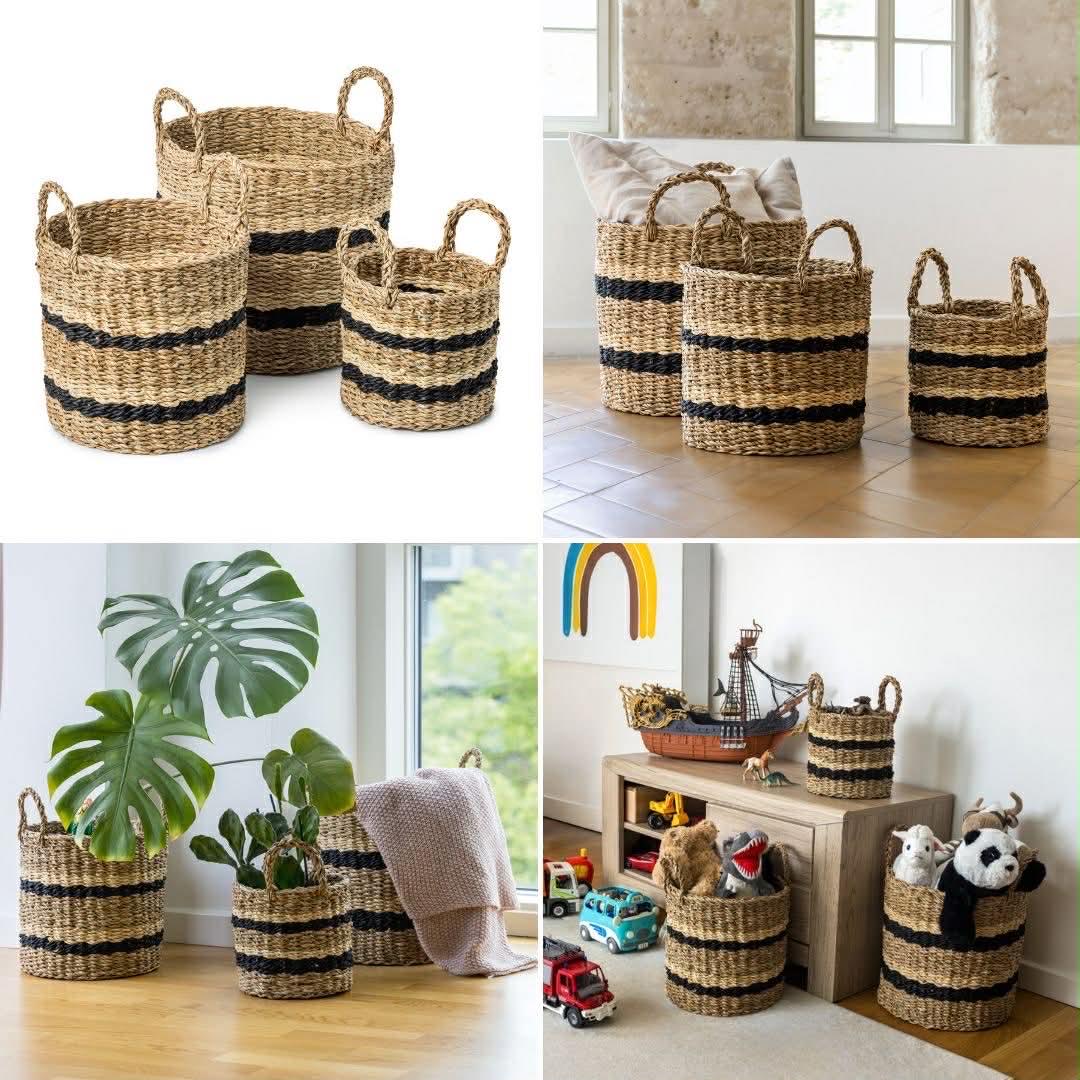 De flettede kurve i søgræs med smukke striber er både dekorative og praktiske – perfekte til at holde styr på hverdagen med stil. 🫶🏼