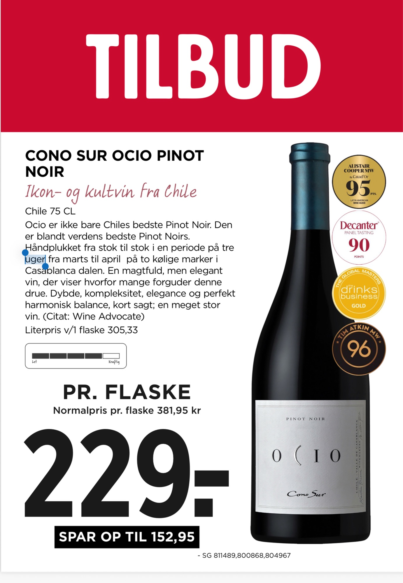 Ocio er ikke bare Chiles bedste Pinot Noir. Den er blandt verdens bedste Pinot Noirs. Håndplukket fra stok til stok i en periode på tre uger fra marts til april på to kølige marker i Casablanca dalen. En magtfuld, men elegant vin, der viser hvorfor mange forguder denne drue. Dybde, kompleksitet, elegance og perfekt harmonisk balance, kort sagt; en meget stor vin. (Citat: Wine Advocate)