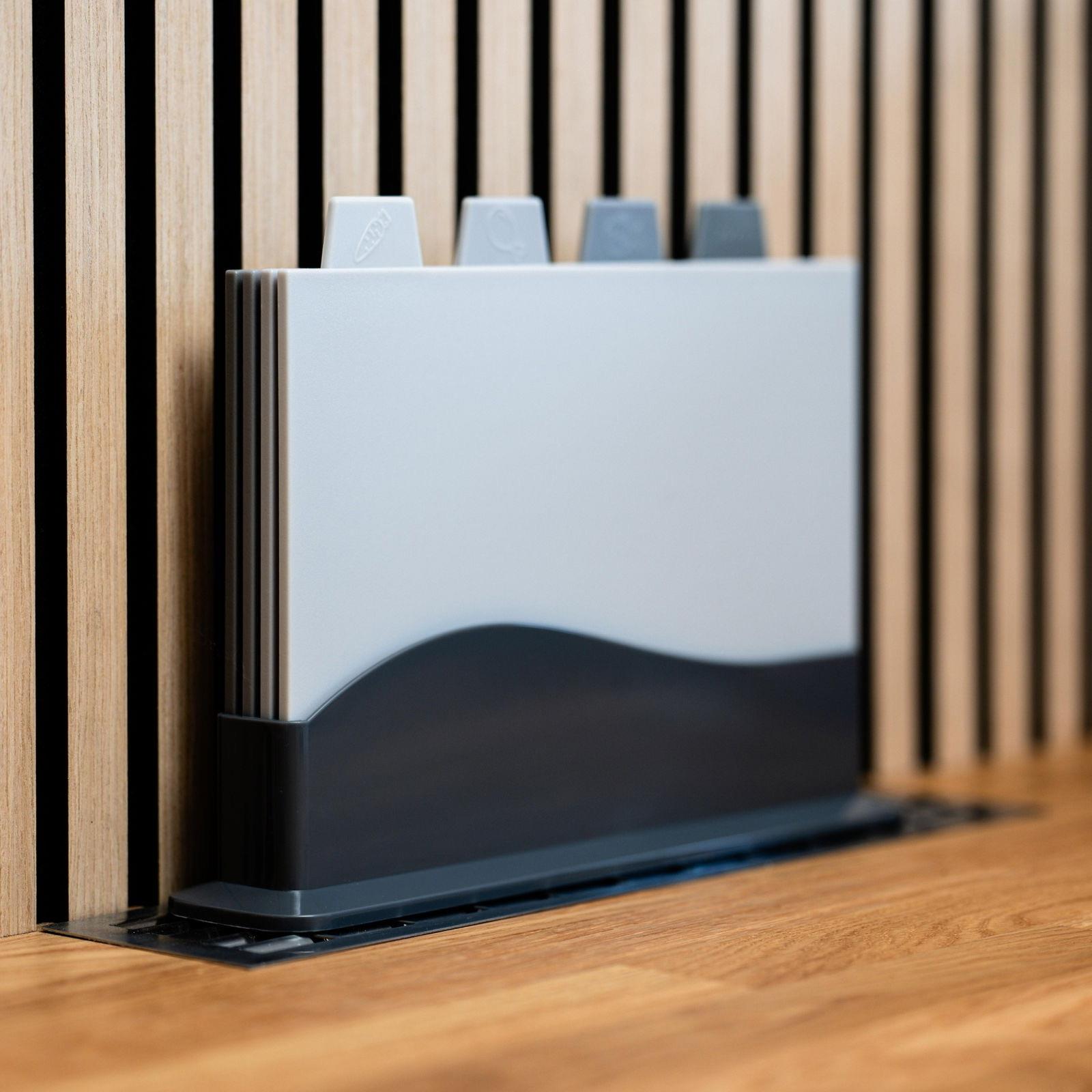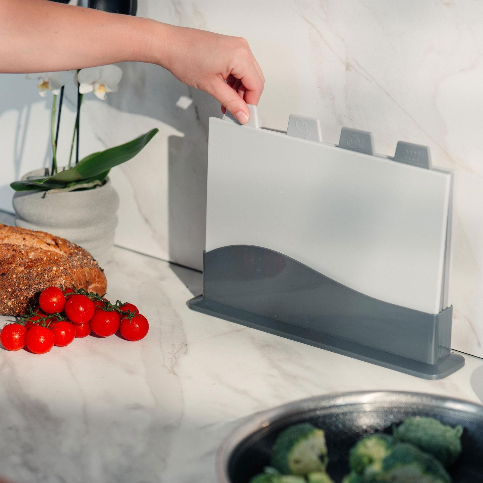 Gør madlavningen nemmere og mere organiseret med dette stilrene skærebrætssæt i 4 dele. Med separate brætter til fx kød, grøntsager, fisk og brød undgår du krydskontaminering – og holder køkkenbordet ryddeligt med den medfølgende kompakte holder! 🧼🍽️