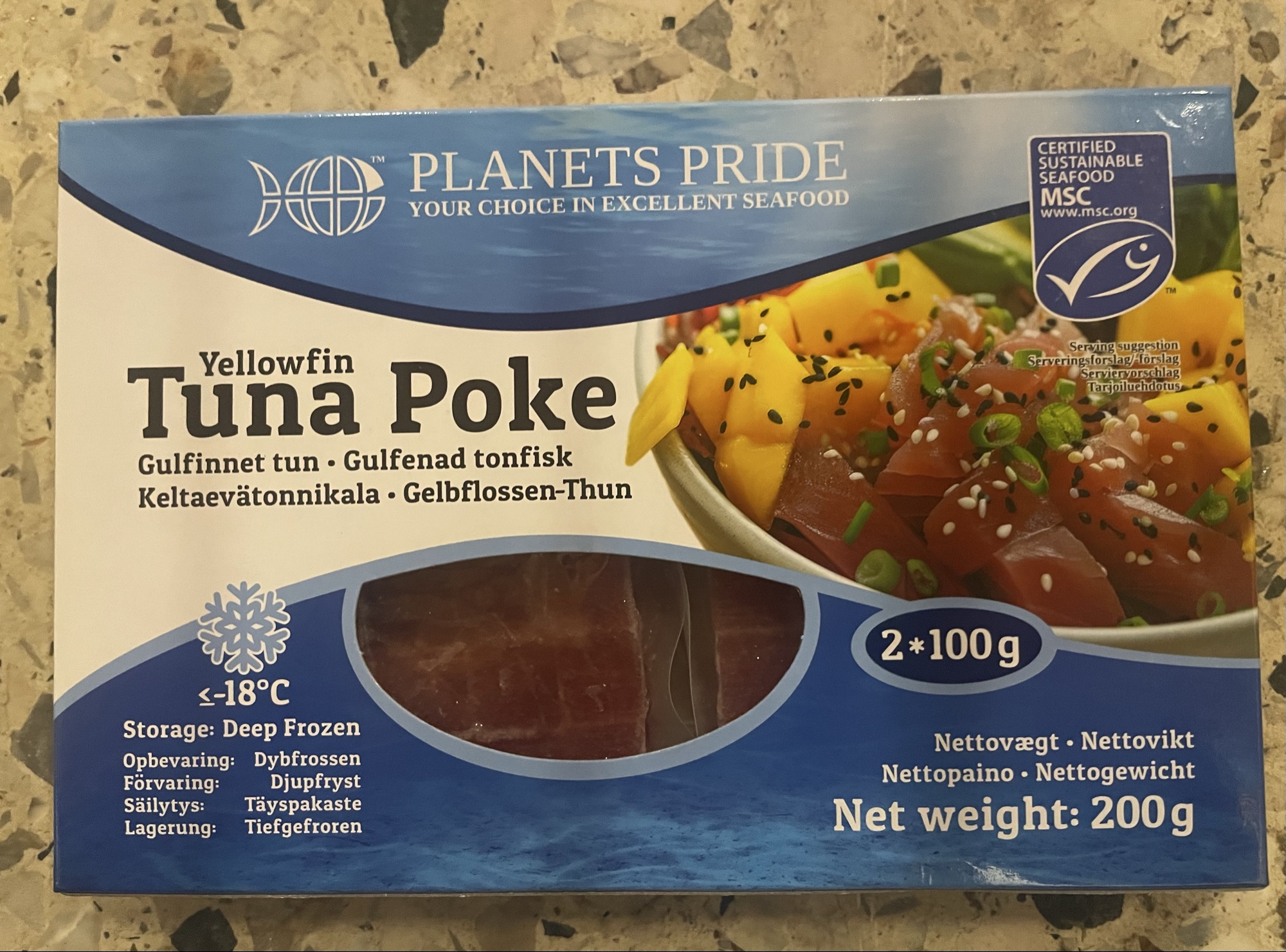 Det er gulfinne-tun (yellowfin tuna) — rå tuntern som er dybfrosne. Den type bruges typisk til sushi, poke bowls eller hurtigt stegt tun.
